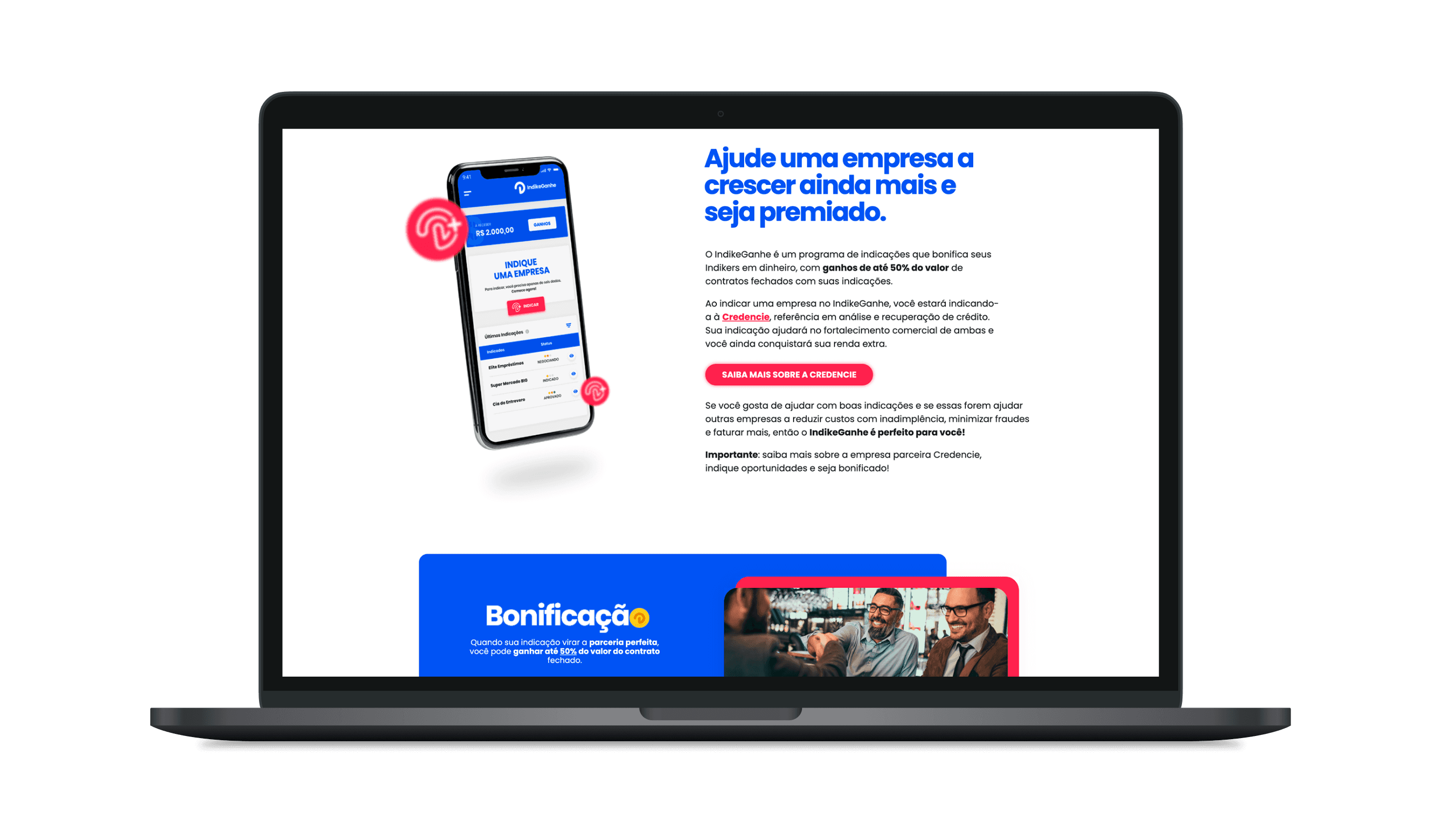 Um produto digital baseado em tecnologia, que oferece valor e funcionalidade aos usuários através do programa IndikeGanhe da Credencie/Serasa.